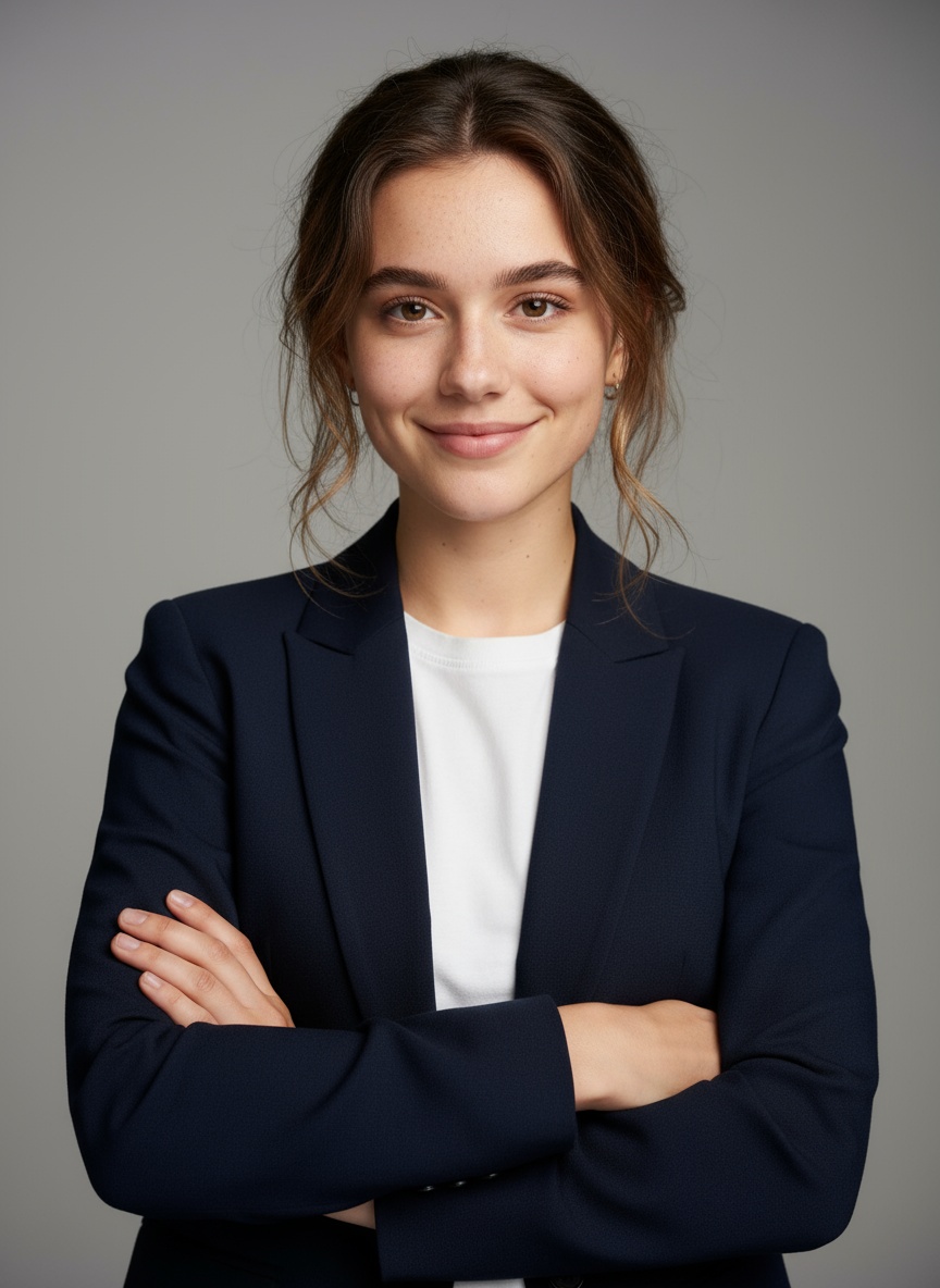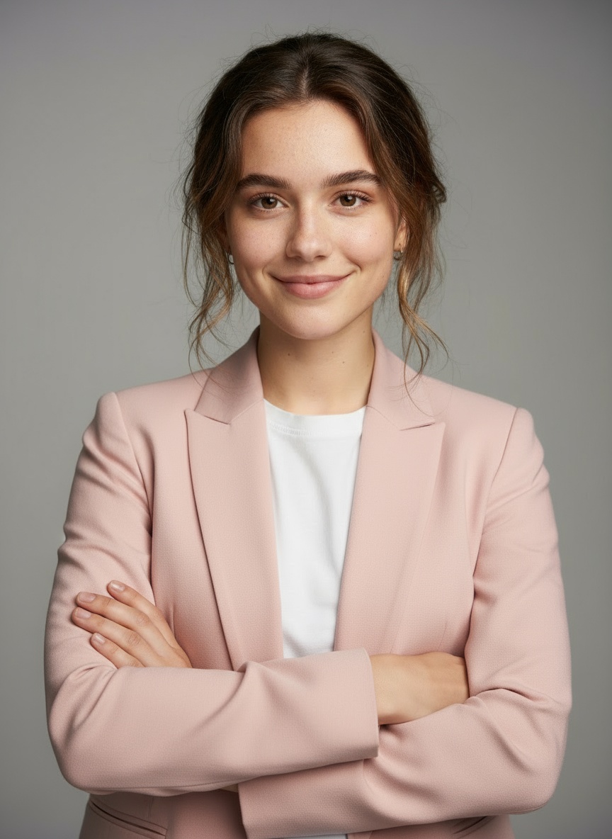 “Generate a realistic portrait of a young professional woman in a casual blazer and light blouse, with studio lighting, soft highlights, and a clean minimal background.”