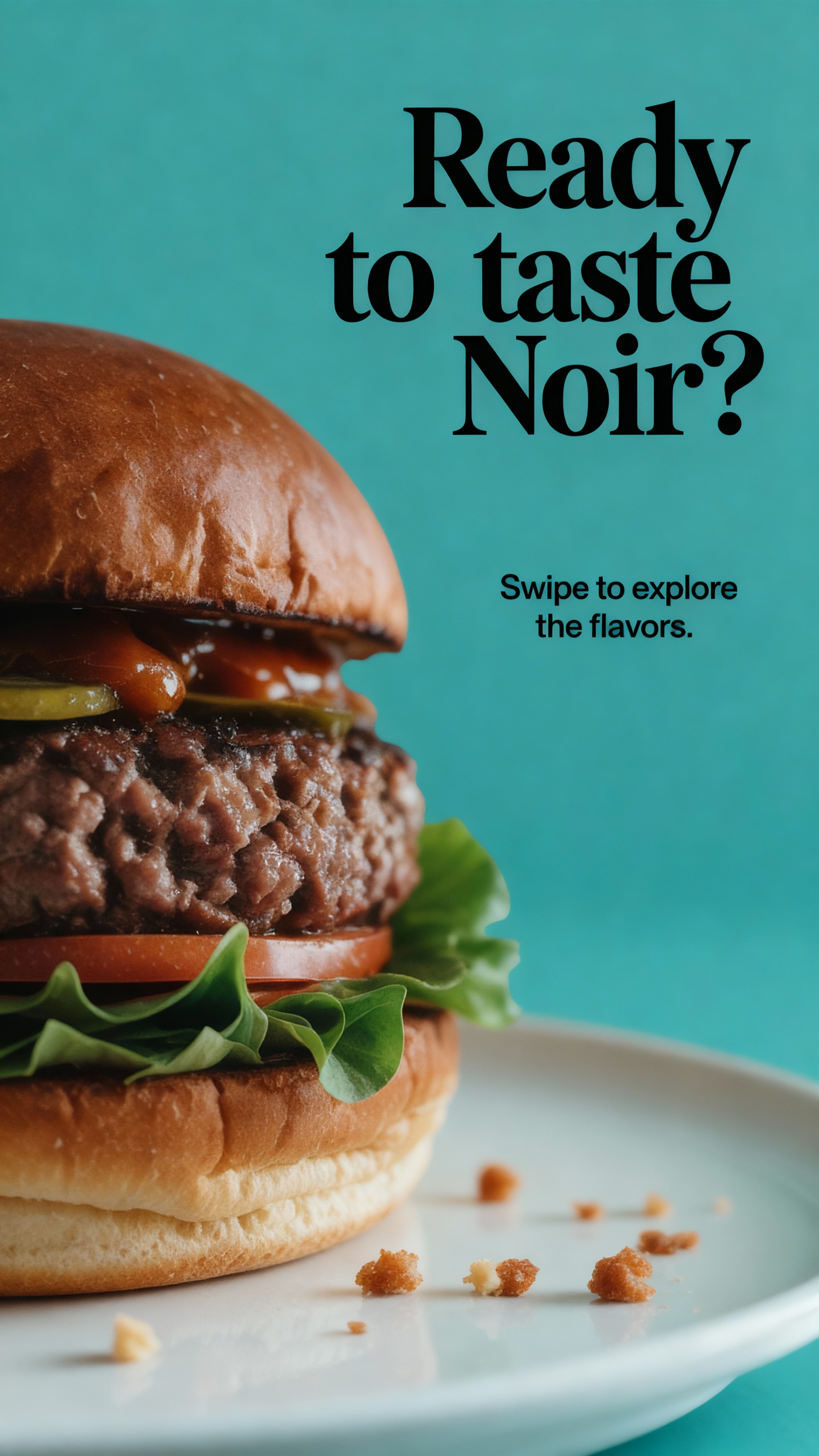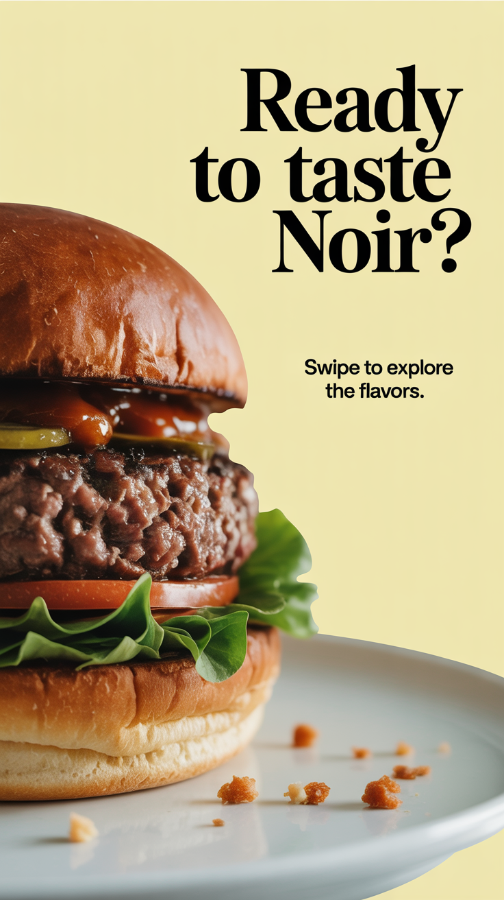 “Create a dynamic gourmet burger ad with ingredients floating mid-air, editorial lighting, pastel yellow background, and bold serif text ‘Ready to Taste NOIR?’ — cinematic and visually rich.”