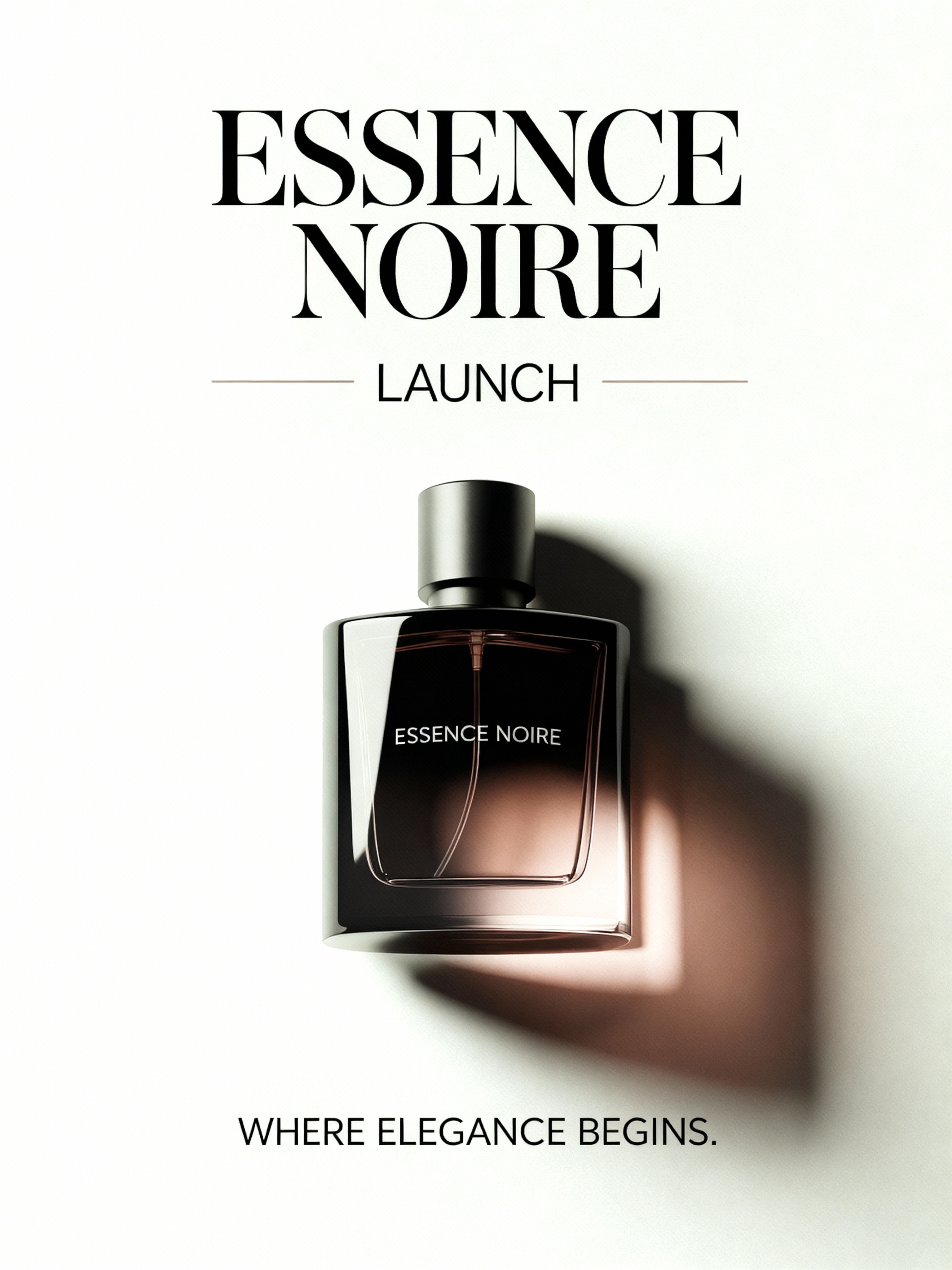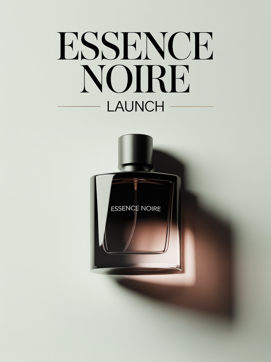 “Design a minimalist editorial poster for a luxury perfume event titled *Essence Noire Launch*. Use clean sans-serif typography, muted beige background, and a perfume bottle as the focal point with soft highlights.”
