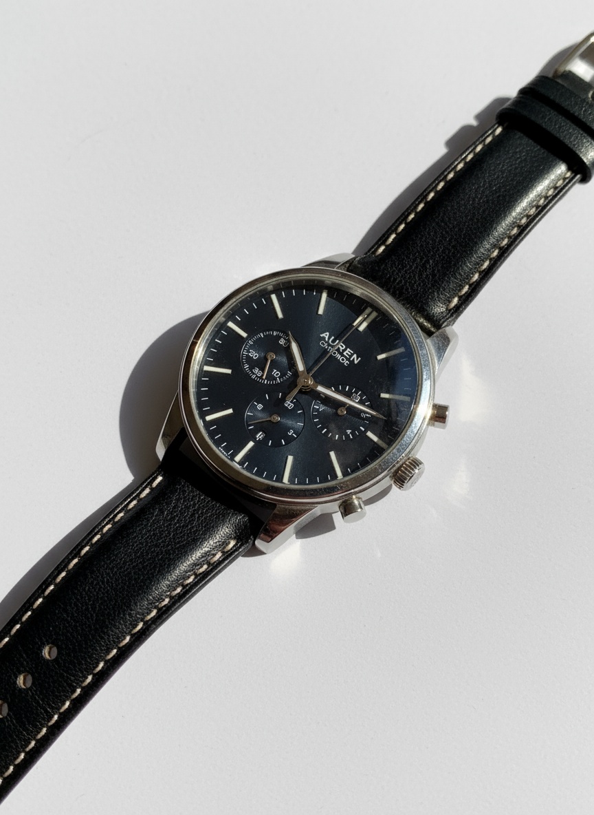 “Create a clean, editorial-style image of the AUREN Chrono watch with sharp focus, metallic detail, neutral background, and luxury lighting for e-commerce use.”
